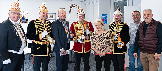 Über hohen Besuch konnte man sich im Hause Förstina-Sprudel in Eichenzell freuen. Seine Tollität Prinz Ralph Medicus Fidelius LXXX. wartete mit seinem Gefolge auf und ehrte so die Inhaberfamilie Ehrhardt, die Geschäftsführung und die gesamte Belegschaft. „Seit vielen Jahren unterstützt der Mineralbrunnenbetrieb besonders großzügig den Rosenmontagszug“, so FKG-Präsident Oliver Weißenberger und dankte für die treue Partnerschaft. Sein Dank richtete sich insbesondere in Richtung der Seniorchefin Doris Ehrhardt, die es sich nicht hat nehmen lassen, das Prinzengefolge persönlich willkommen zu heißen. Prinz Ralph Medicus Fidelius lobte in seiner Ansprache das regionale Familienunternehmen, bekannte sich als Fan von „Oma Elli“-Limo und empfahl als ärztlichen Rat nach zu viel Bier (das soll ja vorkommen) ein paar gute Gläser Förstina-Sprudel Mineralwasser. Verkaufsleiter und Prokurist Mario Petry dankte der Gefolgschaft für die Ehre ihres Besuchs. „Als Zugezogener wurde mir sehr schnell bewusst, welch enorme Bedeutung die „Föllsche Foaset“ hier hat und wie besonders die Brauchtumspflege und Karnevalskultur in und um Fulda ist. Gerne unterstützen wir dieses Kulturgut weiterhin“ so Petry. +++