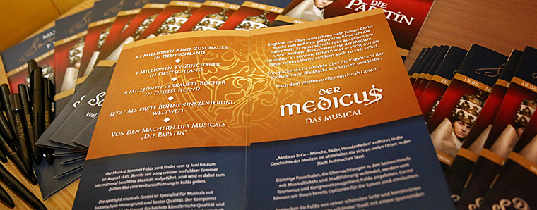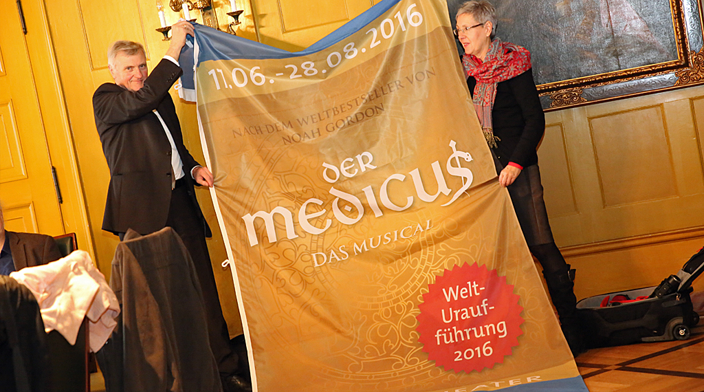 Fulda. Der Historienroman "Der Medicus" wird im Sommer 2016 beim Zyklischen Musical- Sommer in Fulda zu sehen sein. Dies kündigte die Produktionsfirma "Spotlight-Musicals" heute im Stadtschloss an. Das zum ersten mal für die Bühne adaptierte Stück, wird vom 17.06. bis 28.08. 2016 im Schlosstheater zu sehen sein. "England vor über 1000 Jahren- ein junger Christ macht sich auf die abenteuerliche Reise um die halbe Welt. Er muss sich als Jude ausgeben, um unter Arabern die Geheimnisse der Medizin studieren zu können. Dabei finde er nicht nur die Liebe seines Lebens, sondern auch zu sich selbst. Eine packende Geschichte über die Koexistenz der Kulturen und die Macht von Wissen und Liebe", hieß es auf der heutigen Pressekonferenz. Das regionale Erfolgsgespann Dennis Martin und Peter Scholz, zeigten sich schon heute sichtlich erfreut darüber, mit "Der Medicus" an ihre regionale Erfolgsgeschichte anknüpfen zu können. Als literarische Vorlage dient Spotlight der gleichnamige Weltbestseller von Noah Gordon. +++ fuldainfo