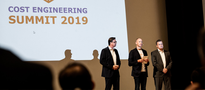 Frank Weinert und Steffen Goebel vom Veranstalter Cost Engineering Expert begrüßen die Teilnehmer zusammen mit Rüdiger Muth (von links) vom Partner des Summits, dem Bundesverband mittelständische Wirtschaft (BVMW). jrphotgraphy.eu