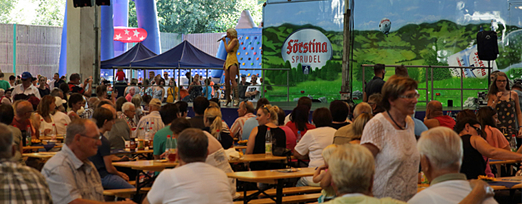 Eichenzell-Lütter. Am heutigen Sonntag fand auf dem Gelände des Mineralwasserproduzenten „Förstina Sprudel“ im osthessischen Lütter bei Eichenzell im Landkreis Fulda bereits zum 16. Mal das traditionelle Förstina Brunnenfest statt. Traditionsgemäß – ist es immer der letzte Sonntag im August – in diesem Jahr mit Außentemperaturen – weit jenseits der 30 Grad – ,wenn die Förstina Sprudel, als Dankeschön an ihre Mitarbeiterinnen und Mitarbeiter sowie Kunden der Region, zum traditionellen Fest auf ihrem Gelände einlädt. So auch am heutigen Sonntag – zur 16. Ausgabe des Brunnefestes besonders viele Familien mit Kindern – den Weg ins osthessische Lütter (Gemeinde Eichenzell) unter das kühlende Dach der Förstina Ligistikhalle fanden. Hohen Besuch erfuhr die Feierlichkeit von den hiesigen beiden Bundestagsabgeordneten Michael Brand (CDU) und Birgit Kömpel (SPD) sowie einigen Bürgermeistern des Landkreises – unter ihnen Bürgermeister der Gemeinde Poppenhausen (Wasserkuppe) Manfred Helfrich (CDU) und Bürgermeister der Gemeinde Eichenzell Dieter Kolb (parteilos).
