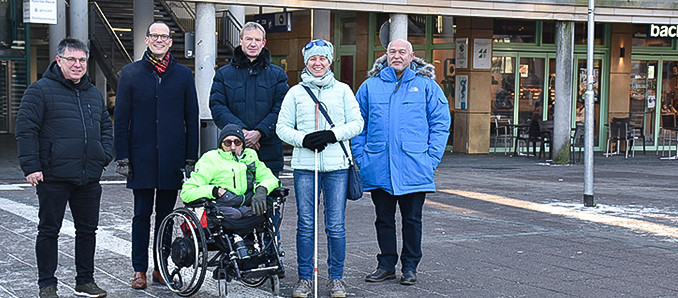 Lea Widmer, Vorsitzende des BMB, ergänzte: „Da die Planungen für eine umfangreiche Umgestaltung des Bahnhofs-Umfeldes sowie des ZOB sicherlich noch einige Jahre dauern werden, freuen wir uns, dass nun mit dem Aufkleben eines temporären Blindenleitsystems eine praktikable Lösung gefunden werden konnte.“ Bei dieser Maßnahme habe besonders der Zebrastreifen zwischen dem Treppenaufgang und den Bushaltestellen im Fokus gestanden, da dort keine tastbaren Bordsteinkanten für Blinde und Sehbehinderte vorhanden sind. Für Gehbehinderte und Rollstuhlfahrer sei der Streifen gut nutzbar, da er keine Stufen hat, durch die neuen Elemente sei er jetzt zudem für Blinde und Sehbehinderte tastbar und durch die kontrastreiche Gestaltung der tastbaren Elemente auch gut sichtbar, betonte Widmer. +++ pm