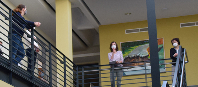Landrätin Peggy Greiser und Krisenstabsleiterin Susanne Reum haben am Donnerstagmorgen alle Mitarbeiter des Gesundheitsamtes im Flur des Meininger Landratsamtes zu einer Beratung versammelt, um sich bei ihnen für die derzeit geleistete nicht alltägliche Arbeit zu bedanken. Der Fachdienst Gesundheit erhält in der Corona-Krise personelle Unterstützung durch Mitarbeiter sowie Auszubildende aus anderen Fachbereichen der Kreisbehörde.