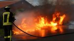 Große Flammen schlagen während der Löscharbeiten aus dem Auto