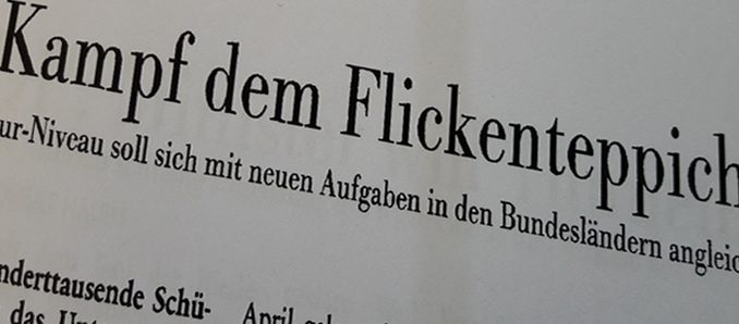 Leider ist aber auch der Flickenteppich politisch in Verruf geraten, hat er – trotz seiner bodenständig-mitteleuropäischen Abkunft – den Ruf des Unvollendeten, Unseriösen, Fehlerhaften, Irrlichternden und wird demzufolge mit vielen unerfreulichen politischen und allgemein gesellschaftlichen Phänomenen in Verbindung gebracht. So werden z.B. der offenen Ganztagsschule, dem Spockhöveler Wald, der Gesundheitsversorgung von Asylsuchenden, dem Dateneigentum und dem Datenschutzgesetz, der polizeilichen IT-Landschaft, dem EU-Urheberrecht, der Aus- und Weiterbildung im Allgemeinen, sowie Westjordanien, den USA nach Trump und den Textmustern in Adolf Hitlers „Mein Kampf“ im Besonderen flickenteppichähnliche Eigenschaften nachgesagt, ohne das gesagt würde, ob diese Eigenschaften nun auf die zweischäftigen Webstühlen, die Schußrips, die fast unsichtbaren schnurartigen Kettfäden oder den als Schuss verwendeten langen, zusammengenähten Stoffstreifen aus verschiedenen Reststücken zurückzuführen sind.