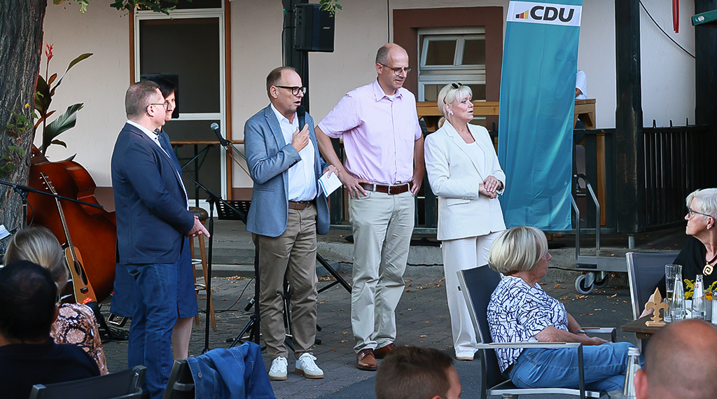 CDU-Stadtverbandsvorsitzender, Bürgermeister Dag Wehner hieß die zahlreich Erschienen auf der Terrasse auch im Namen des geschäftsführenden Vorstandes, Dr. Marion Wagner und Susanne Jobst, willkommen. „Unser traditionelles Spätsommerfest ist eigentlich aus der Notwendigkeit heraus entstanden, weil in der Zeit von Corona unser traditioneller Neujahrsempfang zu Jahresbeginn seinerzeit nicht stattfinden konnte. Vor diesem Hintergrund hatten wir den Empfang in den Sommer verlegt und als Freiluftveranstaltung durchgeführt“, berichtete Wehner. Inzwischen habe das Spätsommerfest, das zusätzlich zum Jahresempfang des Stadtverbandes stattfindet, seinen festen Platz im Veranstaltungskalender der politischen Vereinigung und werde gut angenommen.