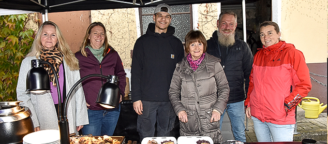 Eine große Anzahl Gäste unterschiedlichen Alters waren gekommen. Sie ließen sich Gänsebraten mit Klößen, Soße, Rotkraut und einem Bratapfel gefüllt mit Marzipan schmecken. Natürlich konnte man Nachschlag holen oder sich auch für immobile Freunde und Bekannte ein Menü einpacken lassen. Die Menüs wurden in einem ökologisch verwertbaren Behältnis ausgegeben. Mantel teilen, wie es der Heilige Martin getan habe, sei ein gutes Sinnbild, um am Martinstag etwas von Herzen weiterzugeben und auch ein Zeichen zu setzen, so Michael Glas mit seinem Mitarbeiter Gabriel König. Caritas-Geschäftsführerin Susanne Saradj bedankte sich für die großzügige, wiederkehrende Spende.