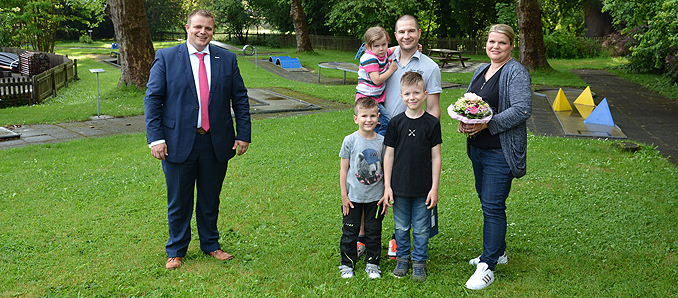 Bürgermeister Benjamin Tschesnok (links) wünschte den neuen Pächtern Steffen und Jana Baumgart einen guten Start. Mit dabei waren auch deren Kinder Niklas, Thilo und Lara.