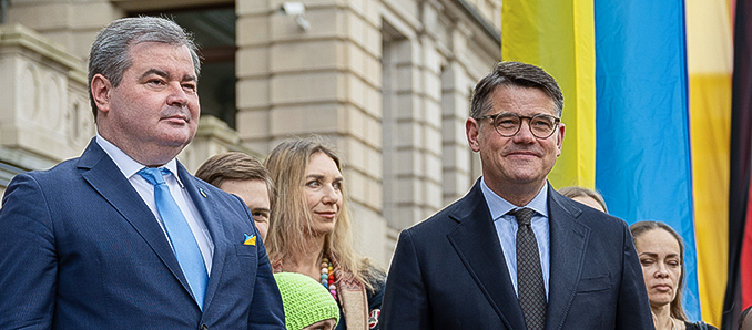 „Für uns Ukrainer ist die Freiheit von unschätzbarem Wert. Wir haben das in der Geschichte mehrmals bewiesen. Im vergangenen Jahr haben wir gezeigt, dass wir unsere Werte mutig verteidigen – zur Not auch mit dem eigenen Leben. Wir werden diesen Krieg gewinnen, weil es für uns die einzige Option ist. Dabei sind wir auf die Unterstützung unserer Partner angewiesen. Die Schnelligkeit dieser Unterstützung ist entscheidend. Glauben Sie an uns und unterstützen Sie uns weiter! Ich danke Hessen sehr für die bisher geleistete Hilfe“, sagte der Generalkonsul der Ukraine in Frankfurt, Vadym Kostiuk.