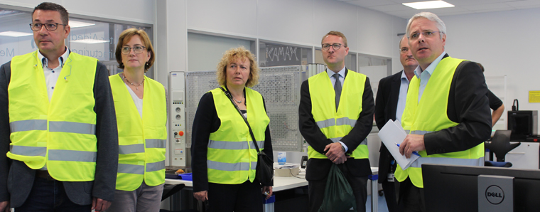 Kai Uwe Braun und Dr. Markus Schiffmann stellen Erstem Kreisbeigeordnetem Dr. Jens Mischak, Hombergs Bürgermeisterin Claudia Blum, Andrea Ortstadt (Wirtschaftsförderung) und Harald Raschel vom Arbeitgeberservice der KVA Vogelsbergkreis Kommunales Jobcenter (von rechts) das neue Ausbildungszentrum vor. Foto: Sabine Galle-Schäfer