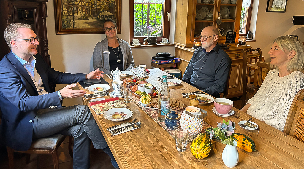 Seit dem Jahr 1720 prägt der Lenzenhof das Bild der Vogelsbergstraße in Schotten. Ein neues Kapitel in der Geschichte des historischen Gebäudes begann vor rund sieben Jahren, als Olympia Borys und Jürgen Schwab das Haus entdeckten und sich in seinen besonderen Charme verliebten. Beim Unternehmensbesuch von Landrat Dr. Jens Mischak berichteten sie, wie aus dieser Begeisterung schließlich das „VulkanWohnzimmer“ mit der angegliederten „VulkanRösterei“ entstand – ein Ort, der zum Genießen und Verweilen einlädt.