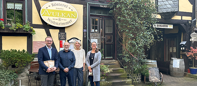 Landrat und Wirtschaftsdezernent Dr. Jens Mischak gemeinsam mit Susen Neumann, Arbeitgeberservice der KVA Vogelsbergkreis – Kommunales Jobcenter zu Besuch im VulkanWohnzimmer. Olympia Borys und Jürgen Schwab stellen dort die Besonderheiten des Betriebs vor.