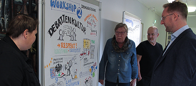 Einig waren sich alle, dass die aktuelle gesellschaftliche Situation nur im gemeinsamen, konstruktiven und auch kontroversen Dialog aller Demokraten und im gemeinsamen Eintreten für Demokratie auch in krisenhaften Zeiten bewältigt werden kann. Die Fachstellen für Demokratie bereiten dafür aktuell neue Gesprächsformate vor. Ausdrücklich begrüßt Erster Kreisbeigeordneter Dr. Jens Mischak diesen Ansatz: „Gerade in Krisenzeiten ist es wichtig, unsere demokratischen Strukturen und Werte zu erhalten.“ Dokumentiert wurden die Diskussionen der Demokratiekonferenz von der Fuldaer Künstlerin Martina Theisen mit der Methode des „Graphic Recordings“. Die Grafiken sind noch bis zum 28.Oktober in der Kreisverwaltung Lauterbach im Foyer vor dem Sitzungssaal Hoherodskopf zu sehen. +++ pm