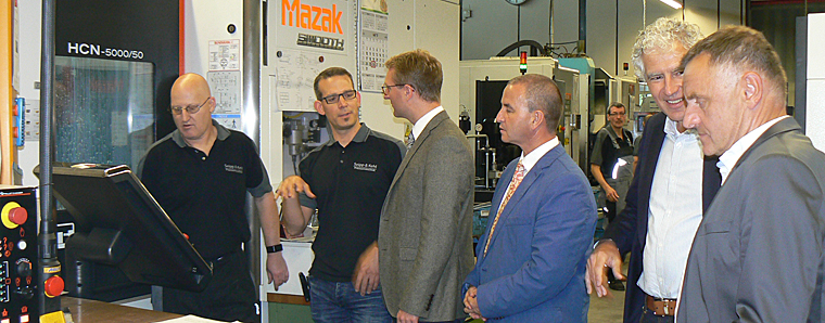 Zudem versucht Seipp & Kehl „Externe“ als Mitarbeiter zu gewinnen. Bislang haben die Chefs da durchaus positive Erfahrungen gemacht. Gut eingespielt hat sich zudem die Zusammenarbeit mit der Behindertenhilfe, die einige Fertigungsarbeiten übernommen hat. Schwierig hingegen gestaltet sich die Integration von Flüchtlingen in den Arbeitsmarkt – und zwar wegen der Sprachbarriere. „Wir haben hochkomplexe Maschinen, um die Arbeit daran erklären zu können, müssen die Flüchtlinge unsere Sprache sprechen“, verdeutlichte Herzberger. „Wir versuchen, unseren Betrieb bekannt zu machen – auch über Facebook“, so der Geschäftsführer weiter. So werde versucht, junge Leute anzusprechen. Auch Pendler sollen erreicht werden. „Wie viele fahren nach Frankfurt und wohnen hier? Die könnten doch auch hier arbeiten". Aufträge für neue Mitarbeiter jedenfalls hat Seipp & Kehl genügend. „Wir haben eine sehr gute Auslastung. Teilweise müssen wir Aufträge absagen, weil wir die Lieferzeiten nicht halten können.“ Da stellt sich natürlich auch die Frage nach einer Erweiterung. Die aber steht und fällt mit dem Personal, machte Herzberger deutlich. Ohne zusätzliche Mitarbeiter lässt sich das nicht realisieren. Wirtschaftsdezernent Dr. Mischak zeigte sich beim Rundgang durch das Werk beeindruckt, wie präzise dort gearbeitet wird. Ein salopp formuliertes Lob gab es auch von Thomas Schaumberg: „Ein blitzsauberer Laden!“ +++