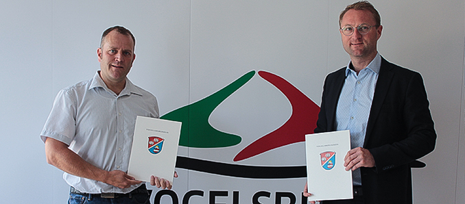 Erster Kreisbeigeordneter Dr. Jens Mischak übergibt Grebenaus Erstem Stadtrat Martin Heddrich gleich zwei Bewilligungsbescheide. Foto: Sabine Galle-Schäfer