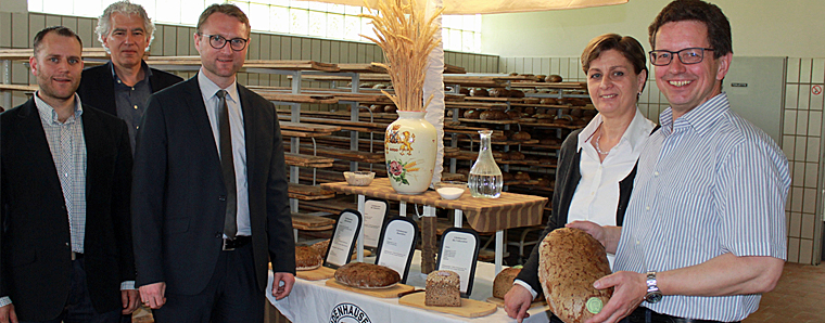 Die Inhaber Martin und Edith Appel (von rechts) präsentieren stolz die Qualität der Produkte aus der Udenhausener Bauernbrot-Bäckerei. Auf dem Foto von links: Erster Stadtrat Martin Heddrich, Diplom-Ingenieur Lorenz Kock (Amt für Wirtschaft) und Vizelandrat Dr. Jens Mischak. Foto: Erich Ruhl-Bady