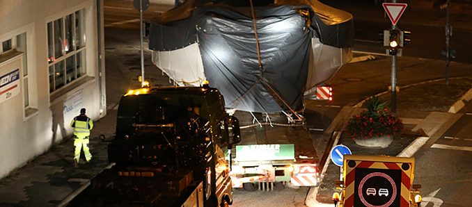 Alsfeld. Ein 227 Tonnen schwerer und 7,20 Meter breiter Schwertransport rollte in der Nacht von Donnerstag auf Freitag durch den nördlichen Vogelsbergkreis. Der Transporter hatte eine Treibscheibe für eine Schachtförderanlage in Philippsthal geladen und startete in Haiger. Die Polizei begleitete den Transportkoloss entlang der B62 durch Lehrbach, Kirtorf, Ober-Gleen, Angenrod, Leusel und Alsfeld mit drei Streifenwagen, laut den Beamten kam es zu keinerlei Störungen. Bei Alsfeld wurde der Schwertransport auf die A5 geleitet, dazu musste die Autobahn kurzzeitig voll gesperrt werden. +++ fuldainfo | pw