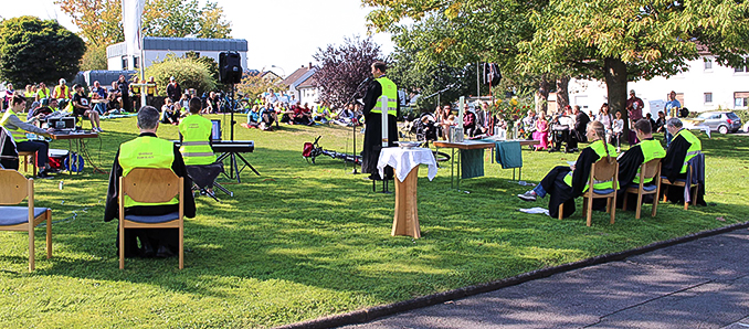 Bei spätsommerlichen Temperaturen konnten die Gottesdienstbesucher den Popsong von Max Giesinger „Irgendwann ist jetzt“ auf sich wirken lassen. Das Lied beschäftigte auch die fünf Pfarrerinnen und Pfarrer in ihrer Predigt. „Es geht darum, nicht immer alles aufzuschieben, was wir längst schon machen wollten,“ sagte Pfarrer Stefan Bürger. Das, wofür man brenne, schiebe man meist nicht auf. Pfarrer Marvin Lange freute sich über die Möglichkeit, mit verschiedenen Gemeinden zusammenzukommen: „Diese Gemeinschaft haben wir in der Pandemie echt vermisst.“ In Zukunft gelte es, in der Kirche, noch mehr gemeinsam zu machen, sagte Pfarrerin Anke Mölleken. Dadurch entstehe die Möglichkeit, „Kirche peppig zu gestalten.“ Auch in der Bibel komme die Mahnung vor, Dinge nicht aufzuschieben, sagte Pfarrer Wolfgang Echtermeyer und zitierte aus dem Neuen Testament: „Wenn ihr heute die Stimme Gottes hört, dann verschließt euch nicht.“ Gottes Stimme könne man in der Natur ebenso wahrnehmen, wie beim Gottesdienst feiern. Es gelte, den Moment zu schätzen und in der Gegenwart zu leben, beschloss Pfarrer Christian Pfeifer die gemeinsame Predigt der fünf evangelischen Geistlichen.