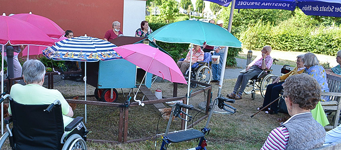 „Vermutlich sind die Senioren so begeistert von den Tieren, weil fast alle früher selbst welche hatten“, gibt die Leiterin der sozialen Betreuung einen Einblick. Dadurch haben sie und ihr Team zahlreiche Anknüpfungspunkte in den Biografien der Bewohner. Im Foyer gibt es eine Ausstellung „Vom Ei zum Huhn“ sowie Bastelmöglichkeiten. Und Gedächtnisspiele, Geschichten und Lieder zum Thema können direkt vis-à-vis mit den Gefiederten stattfinden. Neben all dem, was vom Team geplant wird, gibt es den ganzen Tag Raum für spontane Runden. Senior:innen finden wechselnden Konstellationen auf den Plätzen rund um das Hühnerhaus ein. Während die Gäste kopfnickend mit kehligem „Gaack, gack, gack!“ oder „Ooorgh, ooorgh!“ durch das Gras staksen, erzählen sich die Bewohner des Mediana St. Ulrich von ihren Erfahrungen mit Haustieren, sie sprechen mit den Hühnern oder schauen ihnen einfach nur beim Picken zu.