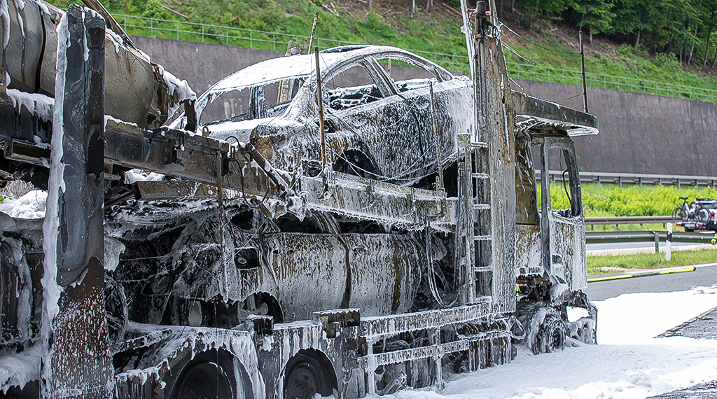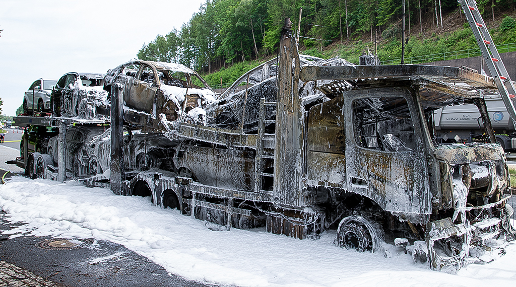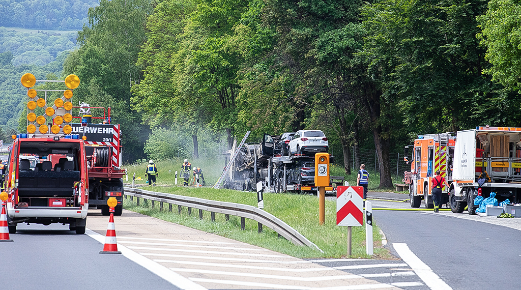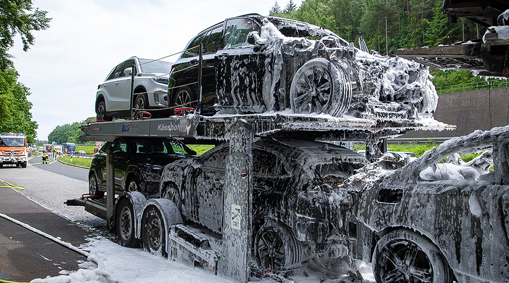 Mit E-Autos beladener Autotransporter gerät auf A7 in Brand