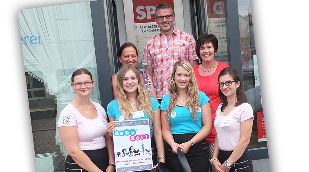 Begleitet wird das Quartett bei seinem Besuch in der SPD-Geschäftsstelle von Lehrer Frank Wagner und von Andrea Giesler von den Wirtschaftsjunioren Fulda. Die Wirtschaftsjunioren hatten das Projekt von den ersten Schritten an begleitet und gefördert. Mit ihrer Geschäftsidee „BabyRoll“ waren die Zuse-Schülerinnen in den Wettbewerb gegangen. Es handelt sich dabei um einen Auto-Babysave, der ein integriertes Untergestell mit Rädern besitzt. Das kann per Knopfdruck ohne großen Aufwand ausgefahren werden, und so wird der Babysafe ruckzuck zum Kinderwagen. „KaSoLiLiMa GmbH“ nennen die jungen Frauen ihre Firma, abgeleitet aus ihren Vornamen. Lisa-Marie Neidhart, die Sprecherin des „Unternehmens“, sagt: „Wir wollten gerne etwas für Kinder machen. Und Mütter haben uns geschildert, wie schnell der Arm schwer wird, wenn man den Babysafe tragen muss.“ Dies kann Birgit Kömpel als zweifache Mutter nur bestätigen.