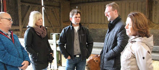 Beim Gang durch zwei große halboffene Ställe, vorbei an einer äußerst gut bestückten Maschinenhalle und dem anschließenden Blick auf weiteres Land, auf dem Oliver Seim gerne noch ein Lager errichten will, staunt Landwirtschaftsdezernent Dr. Jens Mischak nicht schlecht: „Das ist kaum vorstellbar, dass Sie das alles im Nebenerwerb betreiben - solche Dimensionen würde man vielleicht bei einem Vollerwerbsbetrieb vermuten.“ Doch für Oliver Seim ist seine Mutterkuhhaltung und die Bewirtschaftung der rund 377 Hektar Land eine Mischung aus Geschäft und Hobby - „unser Erwirtschaftetes investiere ich in Maschinen, glaube ich“, sagt er. Sein Herz schlägt für seinen Fuhrpark, das merkt und sieht man sofort. Jetzt soll noch Lagerkapazität für Getreide, Futter und Düngemittel geschaffen werden.
