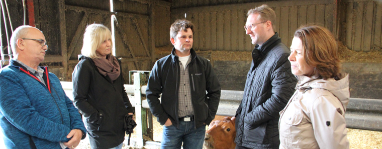 Gespräch im Stall (v. l.): Eckhard Kömpf (Gemeindevorstand Gemünden), Sonja und Oliver Seim, Landwirtschaftsdezernent Dr. Jens Mischak und Amtsleiterin Anja Püchner (Amt für Wirtschaft und den ländlichen Raum). Foto: Gaby Richter,