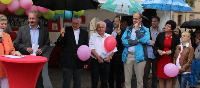 Fulda. Der Nieselregen war kein Hinderungsgrund – zahlreiche Menschen waren der Einladung des zweiten Jahrgangs der derzeitig in Ausbildung befindlichen Schülerinnen und Schüler der Caritas-Altenpflegeschule gefolgt und für ihre Aktion pro Altenpflegeberuf auf dem Universitätsplatz im Zentrum Fuldas zusammengekommen. Mit dabei waren auch Diözesan-Caritasdirektor Dr. Markus Juch und der Caritas-Aufsichtsratsvorsitzende Msgr. Elmar Gurk sowie die Fuldaer Bundestagsabgeordneten Michael Brand und Birgit Kömpel.