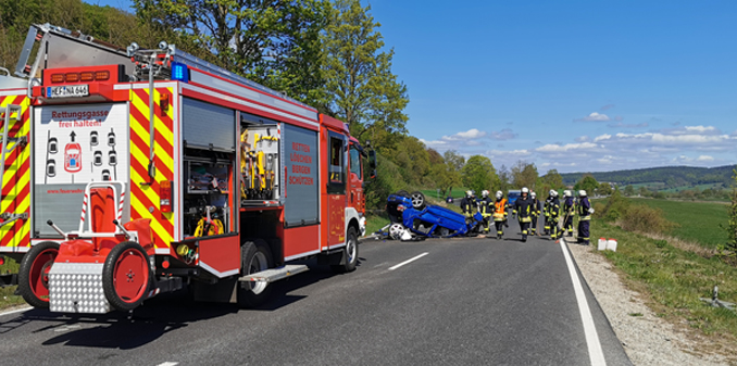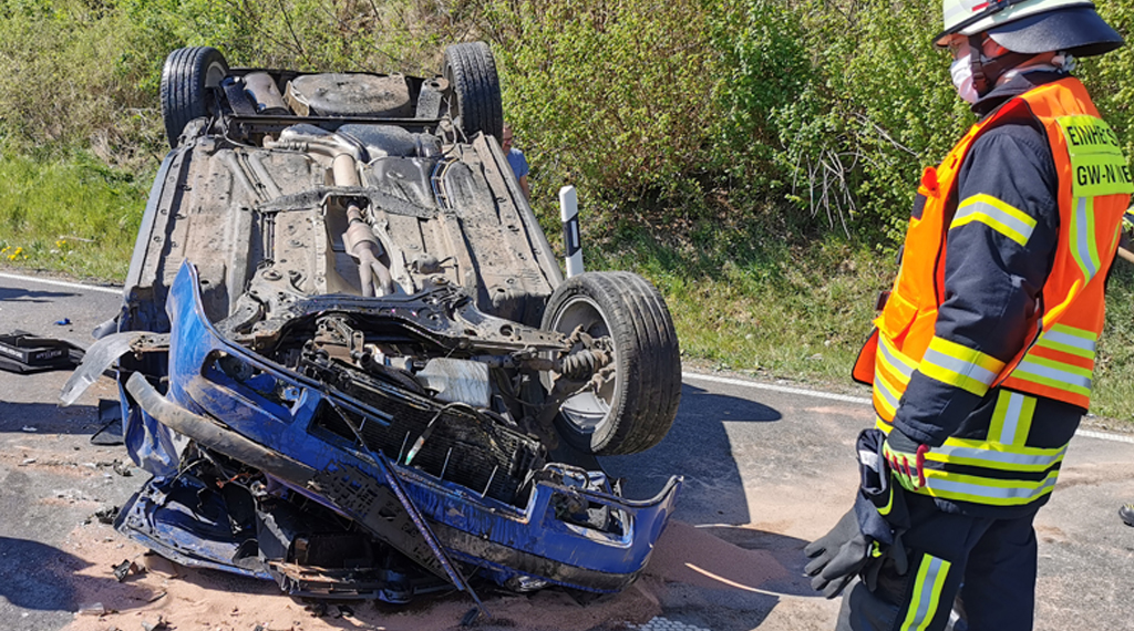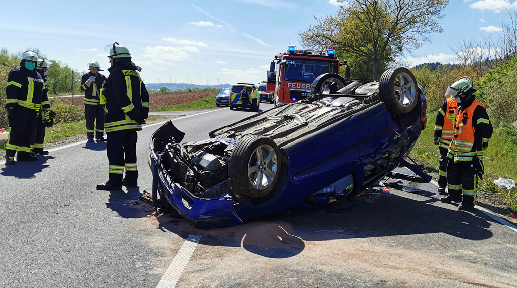 Am Samstagmittag ereignete sich auf der B62 zwischen Niederaula und Bad Hersfeld gegen 14.10 Uhr ein Verkehrsunfall mit einer verletzten Person. Der Fahrer eines VW`s befuhr mit seinem Fahrzeug die B62 von Niederaula in Richtung Beiershausen. Kurz nach dem Parkplatz verlor er aus bisher ungeklärter Ursache die Kontrolle über sein Fahrzeug. Der VW kam nach links von der Fahrbahn ab, schleuderte über die Gegenfahrbahn und durchpflügte einen Flutgraben. Im weiteren Verlauf überschlug sich das Fahrzeug und kam schließlich auf der Gegenfahrbahn auf dem Dach zum Stillstand. Bei dem Unfall wurde der Fahrer verletzt und musste mit dem Rettungswagen in ein Krankenhaus gefahren werden. Die Feuerwehr aus Niederaula wurde zur Unfallstelle alarmiert, um auslaufende Betriebsstoffe aufzunehmen und die Fahrbahn von Trümmerteilen zu reinigen. Während der Rettungs- und Bergungsarbeiten musste die B62 in beiden Richtungen für eine Stunde voll gesperrt werden. Über die Höhe des Sachschadens konnten noch keine Angaben gemacht werden, am PKW entstand wirtschaftlicher Totalschaden. +++ yk