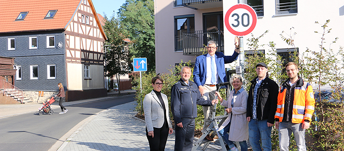 Landrat Manfred Görig und Bürgermeisterin Dr. Birgit Richtberg enthüllten im Beisein von Polizei, Hessen Mobil und Straßenverkehrsbehörde das 30er-Schild vor dem Altenwohnheim LuWiA. Foto: Gaby Richter