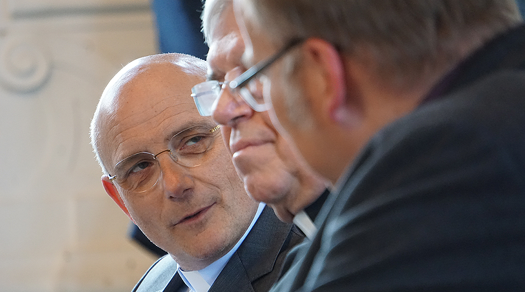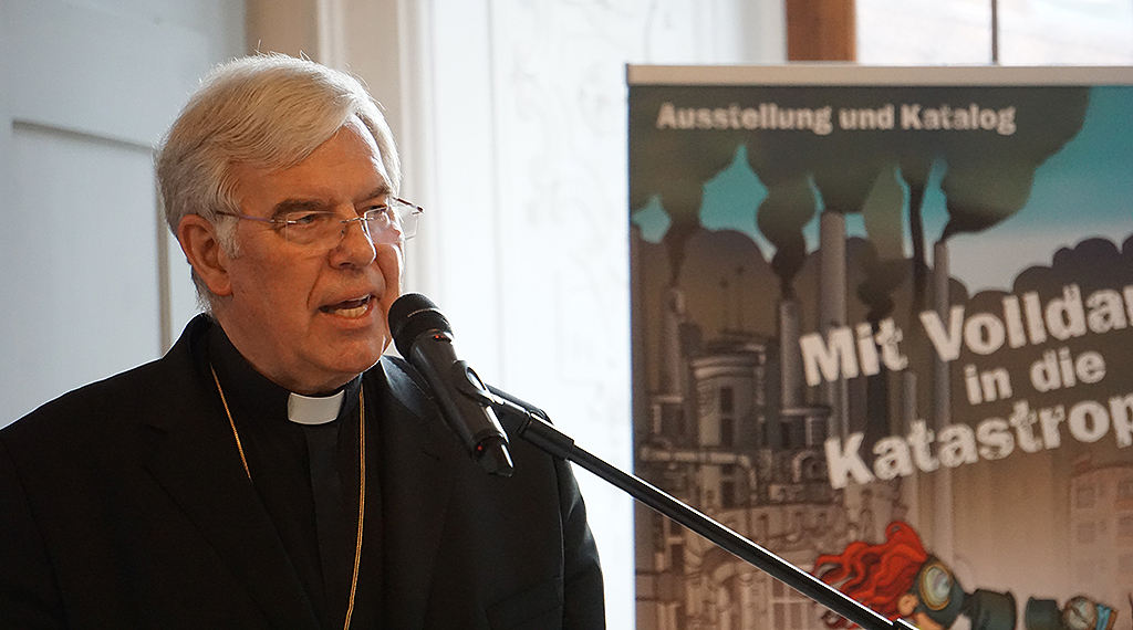 In Funktion als Bischofsvikar für die Weltkirche richtete Weihbischof Professor Dr. Karlheinz Diez an die Anwesenden ein Grußwort. „Ich gebe zu, zuerst ein wenig geschluckt zu haben, dass zu so einem ernsten und bedrohlichen Thema ausgerechnet mit Karikaturen etwas entgegengesetzt werden soll und ich überlegte, ob der Schuss nicht vielleicht nach hinten losgeht“, so der Bischofsvikar für die Weltkirche, Professor Dr. Karlheinz Diez in seinen einleitenden Worten zur Begrüßung. Der Bischofsvikar weiter: „Doch dann habe ich mich an eine Karikaturenausstellung im ‚Museum für Sepulkralkultur in Kassel‘ erinnert. Sie hatte den Titel ‚Einer geht noch.‘ Und hat auf ebensolche flapsige Art und Weise das Thema ‚Tot und Sterben‘ verarbeitet. Und nach einem ersten Blick in diese Wanderausstellung von Renovabis war ich begeistert. Es ist wohl dieser niederschwellige und leichte Einstieg, der zu einer ernsthaften Auseinandersetzung und hoffentlich zu einem Wandel in unserem eigenen Umfeld führen soll. Die Ironie überzeichnet bewusst oder unbewusst, aber sie erreicht ihr Ziel, sie will ihr Ziel erreichen. Aufmerksamkeit und schließlich auch Veränderung zu erzeugen. Diese Wanderausstellung markiert für die Aktion von Renovabis so etwas wie ein Startcode.“