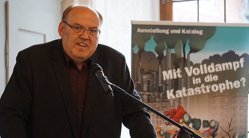 Dass wir diese Wanderausstellung gerne übernommen haben, hat verschiedene Gründe. Wir sind der Auffassung, dass Umwelt und Klimaschutz eigentlich die zentralen Themen dieser Zeit sind. Jedoch sind sie in den vergangenen zwei Jahren - bedingt durch die Corona-Pandemie und durch den russischen Angriffskrieg auf die Ukraine – leider etwas in den Hintergrund getreten. Das ist umso bedauerlicher, weil uns dadurch ein umso größerer Handelsdruck bevorsteht. Durch die Ereignisse Corona und durch den Krieg in Osteuropa wird nicht nur die mediale Aufmerksamkeit gebunden, sondern es werden auch Gewaltressourcen in die Zukunft gebunden. Umso wichtiger war es uns, durch diese Ausstellung, als kleinen lokalen Beitrag, die Themen ‚Umwelt und Klima‘ wieder stärker ins Bewusstsein zu bringen.“ Für „Mit Volldampf in die Katastrophe?“ wurden Künstler und Karikaturisten aus insgesamt 18 europäischen Ländern zusammengeführt, aus West- und Osteuropa. Museumsleiter Dr. Frank Verse: „Das zeigt in meinen Augen überdeutlich, wie übergreifend diese Problematik ist und dass sie Antworten und Handeln erfordert, die ebenso übergreifend stattfinden müssen. All das bringt diese Ausstellung sehr sinnbildlich zum Ausdruck und hat uns unsere Entscheidung daher sehr erleichtert.“