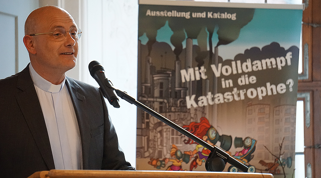 Renovabis-Hauptgeschäftsführer Pfarrer Professor Dr. Thomas Schwartz sprach gestern Abend in Vertretung für den derzeit erkrankten stellvertretenden Geschäftsführer des Renovabis-Hilfswerks, Dr. Markus Ingenlath: „‘Mit Volldampf in die Katastrophe?‘ erinnert an die Renovabis-Pfingstaktion des Jahres 2020/21. Die Ausstellung ist im Grunde die große Herausforderung, die die Umweltproblematik bei uns stellt.“ Und weiter: „‘Du erneuerst das Angesicht der Erde.‘ ist nicht nur eine Heilsverkündigung aus dem 104. Psalm, der zum Namen von Renovabis geworden ist, sondern sie erinnert uns auch an unsere permanente Herausforderung und auch an unsere Aufgabe als Christen, diese Erneuerung, dieses Neuwerden der Schöpfung, auch in unsere eigene Hand zu nehmen. Es ist daher eben nicht nur etwas, was von Gott kommt, sondern als Schöpfer Gottes und Ebenbilder Gottes ist uns diese Bewahrung und Behütung der Schöpfung als Auftrag mitgegeben. Und daran zu erinnern und dies in einer Art und Weise zu tun, dass man zunächst einmal überrascht schaut und zum Nachdenkenden angeregt wird und dann beim zweiten Hinschauen eingeladen wird, um dann in unserer eigenen Umgebung wieder damit konfrontiert wird, wie man selbst etwas zur Bewahrung der Schöpfung tun kann, das ist die Idee hinter dieser Karikaturenausstellung gewesen.“ Nach dem Renovabis-Hauptgeschäftsführer sei dies eben nicht nur ein deutsches Partikularproblem, sondern ein weltweites. Das zweite Opfer nach den vielen Getöteten im Kontext des seit Wochen in der Ukraine herrschenden furchtbaren russischen Angriffskrieges sei die Umwelt.