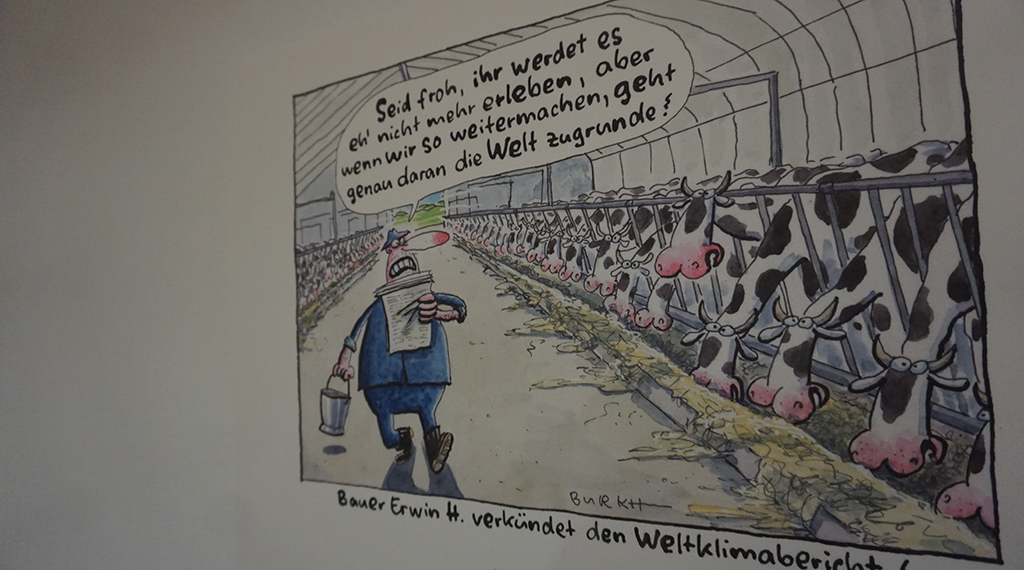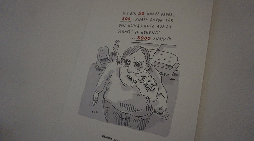 „‘Mit Volldampf in die Katastrophe Fragezeichen‘ – wobei ich das Fragezeichen besonders betonen möchte, zeigt uns, dass mit gemeinsamen Anstrengungen auf diesem Gebiet vielleicht doch noch einiges zu erreichen ist“, begrüßte Museumsleiter Dr. Frank Verse die Gäste der Vernissage und überbrachte ebenso die Grüße des Fuldaer Oberbürgermeisters Dr. Heiko Wingenfeld, der am Dienstagabend terminlich verhindert war. Der Museumsleiter fuhr fort: „Als wir vor einiger Zeit vom Bistum angefragt wurden, ob wir diese Ausstellung zeigen können, haben wir das sehr gerne gemacht und zugestimmt, und das, obwohl unser Ausstellungskalender zu diesem Zeitpunkt schon ziemlich gut gefüllt war. Wir haben gewissermaßen aus der Not eine Tugend gemacht. Sie finden diese Ausstellungen verteilt auf drei Etagen und in den Treppenaufgängen. Weitere Karikaturen finden sich im Bereich der Naturkundeausstellung. Wir hoffen, dass Sie die Dialektik zwischen den Lebensräumen, die wir in den Naturkunderäumen ausstellen und den Bedrohungen, die die Karikaturen auch zeigen, erkennen können.