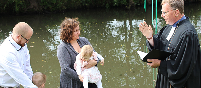 Der kleine Quinn war einer der Täuflinge, die am Samstagvormittag getauft wurden. „Wir haben es genossen, unser Kind direkt am Fluss taufen zu lassen,“ sagte sein Vater Nicolas Taylor. „Es war ein fröhlicher und moderner Gottesdienst,“ stimmte auch seine Frau Anke zu. Die Geschwister Alexander und Lara Klüh aus Hofbieber wurden zusammen getauft. Ihre Eltern hatten über die Medien von dem Tauffest erfahren. Christopher und Agnes Klüh feierten nach der Taufe ein Familienfest im kleinen Rahmen und hatten dafür extra ein Picknick mitgebracht.