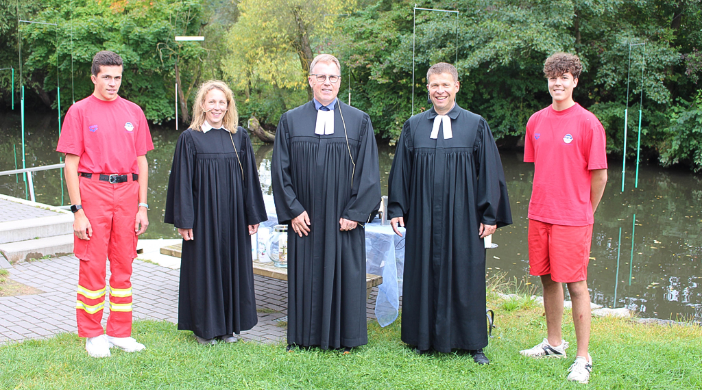 Pfarrerin Jana Koch-Zeißig, Pfarrer Dr. Michael Grimm und Pfarrer Stefan Bürger tauften die Kinder auf den Kanu-Anlegestellen mit Wasser aus der Fulda. Die Geschichte der Arche Noah, symbolisiert durch ein Kanu, hatte die Pfarrer zu einer Dialogpredigt inspiriert. Es sei nicht immer ganz einfach, im gleichen Boot zu sitzen, denn manchmal werde es darin eng, führten die Pfarrer aus. Aber in dem Familienboot wachse auch Geborgenheit und Vertrauen und es sei ein Schutzraum für die Kinder, in einer Welt, in der vieles nicht in Ordnung sei. Während der Taufe wurden Kreativsets ausgeteilt, so dass die Familien bunte Girlanden basteln konnten. Die Patinnen und Paten trugen persönliche Fürbitten für die Täuflinge vor. Für die musikalische Begleitung sorgte die Band der evangelischen Kreuzkirche aus Neuenberg. Zwei Freiwillige von der DLRG sorgten dafür, dass aus den Taufen kein unfreiwilliges Bad in der Fulda wurde.