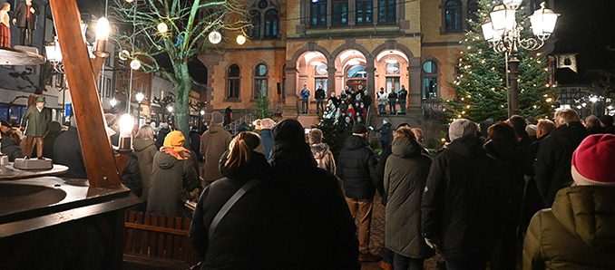 Am Silvesterabend trafen sich die Hünfelder traditionell vor dem Rathaus, um gemeinsam das alte Jahr zu verabschieden. Nach der Ansprache von Bürgermeister Benjamin Tschesnok erklang das Hünfelder Neujahrslied unter den Rathausarkaden. Ein Projektchor und eine Bläsergruppe aus Nüsttal führten das Lied unter Leitung von Regionalkantor Christopher Löbens auf.