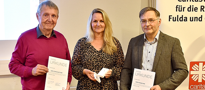 Für ihre zehnjährige Vorstandstätigkeit wurden Raimund Kind und Stephan Büttner mit dem Ehrenzeichen in Silber des Deutschen und des Diözesanen Caritasverbandes ausgezeichnet. Geschäftsführerin Saradj überreichte die Auszeichnung und würdigte die Verdienste der beiden Geehrten.