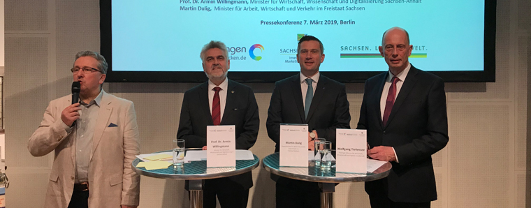 Thüringens Wirtschaftsminister Wolfgang Tiefensee, Sachsens Wirtschaftsminister Martin Dulig und Sachsen-Anhalts Wirtschaftsminister Prof. Dr. Armin Willingmann sprachen bei einer gemeinsamen Pressekonferenz am 7. März 2019 anlässlich der Internationalen Tourismusbörse in Berlin (ITB) über die touristischen Potenziale und Höhepunkte des laufenden Jubiläumsjahres „Bauhaus100“ und stellten auch die mit Spannung erwarteten Themen für das Tourismusjahr 2020 vor.