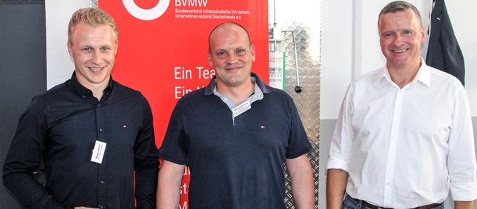 Das ist auch das Credo von Markus Schmitt, Gastgeber dieses Abends und Geschäftsführer der Novadyn Automobiltechnik GmbH. Novadyn ist einer von lediglich 40 Betrieben in Deutschland, die in allen Bereichen des Kfz-Wesens zertifiziert sind. In der Weichselstraße werden Pkw, Nutzfahrzeuge und Caravans gewartet und instandgesetzt, lackiert, vermessen, ausgebeult. Alleinstellungsmerkmal des Unternehmens ist die Oldtimer-Restauration, die Kunden aus ganz Deutschland nach Fulda lockt. Die BVMW-Gäste konnten sich jedenfalls an den Schmuckstücken auf dem Firmengelände nicht sattsehen. Schmitt legt großen Wert auf gute Aus- und Weiterbildung sowie auf ein gutes Miteinander. „Das Betriebsklima ist Chefsache“, sagte Schmitt, der immer wieder von den Mitbewerbern dafür bewundert wird, welch hoch qualifizierte Auszubildende und Mitarbeiter der Novadyn GmbH zur Verfügung stehen.