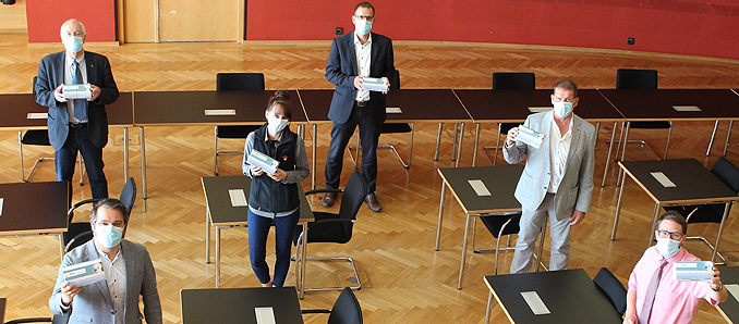 „Eine solche Spende setzt ein wichtiges Zeichen des Zusammenhalts in einer schwierigen Zeit“, sagte Thorsten Stolz im Beisein der Bürgermeister Daniel Glöckner (Gelnhausen), Carsten Ullrich (Sinntal) und Albert Ungermann (Linsengericht) sowie Isabelle Hofmeister, REWE-Marktleiterin in Gelnhausen. Rainer Lapp erklärte, er wolle der Region mit dieser Material-Spende etwas zurückgeben und jene unterstützen, die für andere da sind, auch wenn dies zurzeit nicht immer einfach sei. Hierbei soll der Mund-Nasen-Schutz für mehr Sicherheit und Hygiene in Zeiten von Corona sorgen. Über das Gefahrenabwehrzentrum des Main-Kinzig-Kreises soll die Schutzausrüstung gepackt und verteilt werden. Die drei Bürgermeister bedankten sich sehr für das Engagement des Unternehmers und versprachen, den Mund-Nasen-Schutz mit Bedacht zu verteilen, damit er dort ankommt, wo er am dringendsten gebraucht wird. Thorsten Stolz, Rainer Lapp und die drei Bürgermeister Daniel Glöckner, Carsten Ullrich und Albert Ungermann nutzten die Gelegenheit und tauschten sich über die Situation in den jeweiligen Kommunen aus.