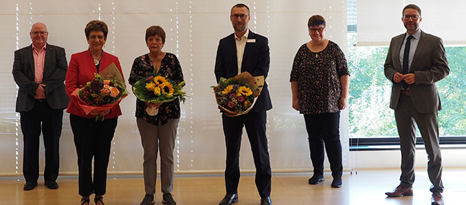 Landrat Thorsten Stolz würdigte gemeinsam mit Ulrike Schmid, Gleichstellungsbeauftragte (Zweite von rechts) und Heinz Neuendorf (links) die Verdienste von Thorsten Münch (Dritter von rechts) und Roswitha Stumpe (Dritte von links). Birgit Herda (Zweite von links) wurde in den Ruhestand verabschiedet.