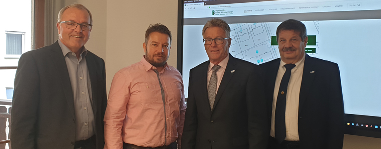 Im Gespräch über notwendige Internetbandbreiten für die Wirtschaft: Firmengründer Horst Becker und Geschäftsführer Carsten Lamm sowie Kreisbeigeordneter Winfried Ottmann und der Leiter des Wirtschafts-Referats im Main-Kinzig-Kreis, Walter Dreßbach.