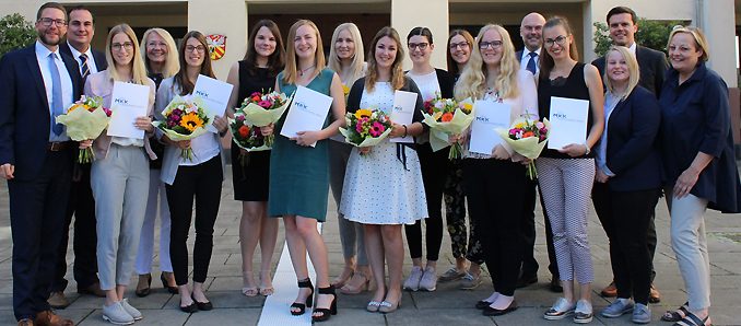 Insgesamt neun Frauen haben ihre Ausbildung zur Verwaltungsfachangestellten erfolgreich abgeschlossen und arbeiten nun in einem der vielen Verwaltungs- und Servicebereiche des Main-Kinzig-Kreises. Landrat Stolz überreichte ihnen die Arbeitsverträge und drückte für die Zukunft drei Wünsche aus: „Hören Sie weiterhin auf Ihr Herz, melden Sie sich zu Wort, gerade auch als junge Menschen, und geben Sie von dem, was Sie hier gelernt haben, auch etwas an die Gesellschaft ab. Kurzum: Bringen Sie sich mit Ihrer ganzen Persönlichkeit weiter ein.“