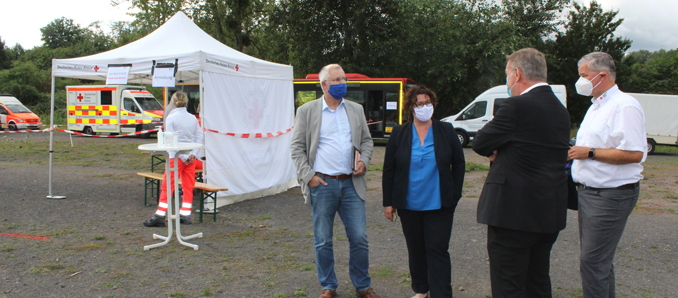 ie mobile Teststation mit Bus und Fahrer aus Hanau und Einsatzkräften des DRK Hanau machte am Freitag erstmals an einem Punkt im Kreisgebiet: Günther Seitz (Gefahrenabwehrzentrum), Erste Kreisbeigeordnete Susanne Simmler, Hanaus Oberbürgermeister Claus Kaminsky und der Hanauer DRK-Geschäftsführer Stefan Betz machten sich selbst ein Bild vom ersten Praxiseinsatz (von links).