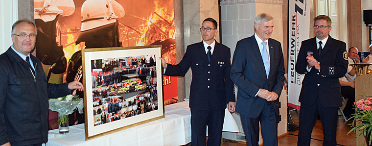 Fulda. Für Fuldas Verwaltungschef und Brandschutzdezernent Gerhard Möller war es der letzte große Empfang als OB für die Feuerwehr, an dem er nicht nur gemeinsam mit Brandschutzamtsleiter Thomas Helmer Ehrungen vornehmen konnte, sondern unerwartet selbst im Mittelpunkt stand. Denn Hans-Peter Kröger, Präsident des deutschen Feuerwehrverbandes, zeichnete Möller mit dem Feuerwehrehrenkreuz in Gold aus. Mit einer Bildkollage sowie einer Sammlung von Modell-Feuerwehrfahrzeugen überraschte Helmer den bald aus dem Amt scheidenden Oberbürgermeister und dankte ihm stellvertretend für die vielen Aktiven für eine ausgezeichnete Zusammenarbeit in den zurückliegenden 12 Jahren.