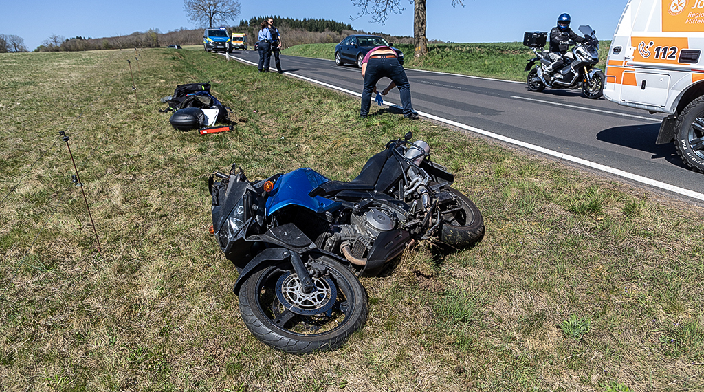 Mit dem Rettungswagen brachte man den schwer verletzten Motorradfahrer in ein Krankenhaus. Die Polizei untersuchte den genauen Ablauf des Unfalls. Für die Rettung musste die Landstraße zeitweise gesperrt werden.