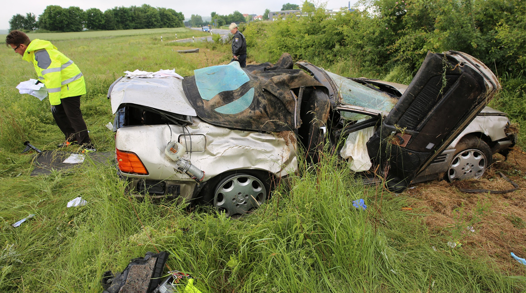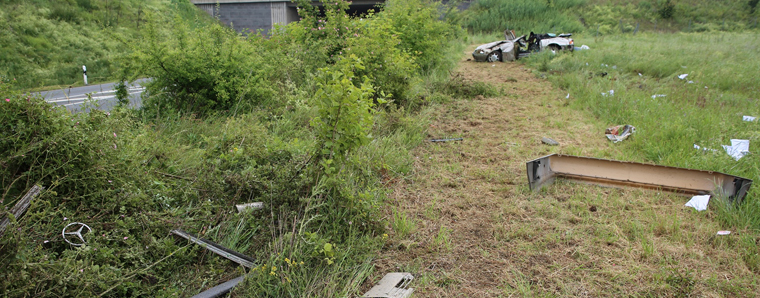 Laut ihren Angaben war der Fahrer offensichtlich nicht angeschnallt und ist bei dem Unfall aus dem Fahrzeug geschleudert worden. Wann genau und warum es zu dem Unfall gekommen ist, wird noch von der Polizei ermittelt. Zur Ermittlung der Unfallursache waren drei Polizeistreifen sowie ein Gutachter vor Ort im Einsatz. Nach ersten Polizeiangaben war das Cabriolet vom Typ Mercedes SL 320 Roadster mit überhöhter Geschwindigkeit auf der Landesstraße von Atzenhain kommend unterwegs und fuhr im Bereich der Zufahrten zur A5 gegen einen Verkehrskreisel. In der Folge soll der Unfallwagen nach rechts in die Böschung geschleudert und sich dann mehrfach überschlagen haben.. „Das Unfallwrack lag weit abseits der Straße und es war neblig“, so ein Polizeisprecher. +++
