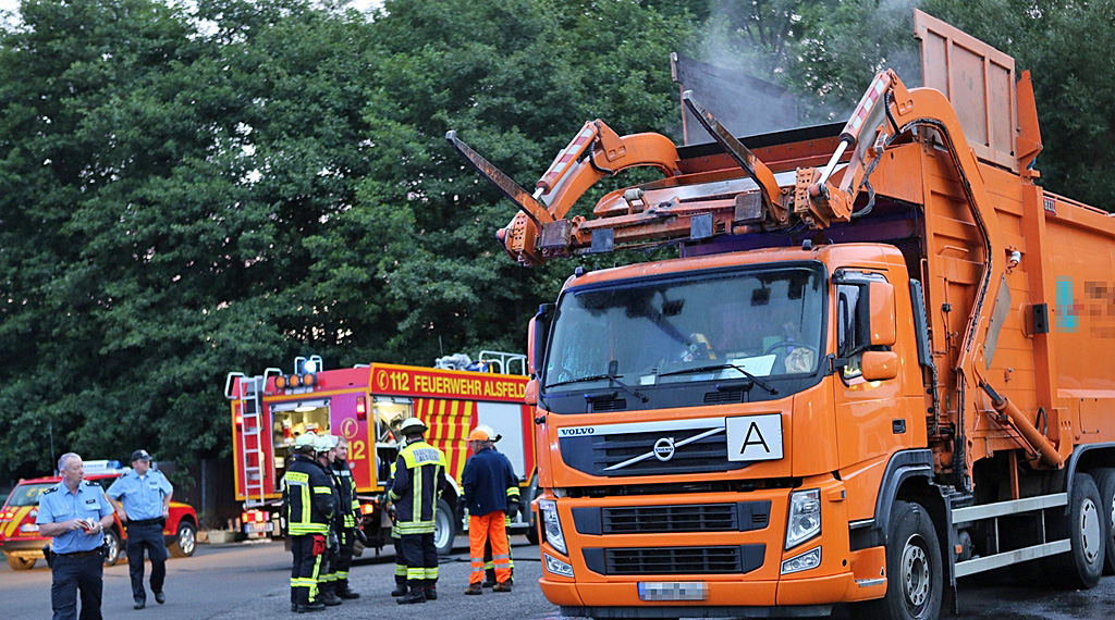 Alsfeld. Ein mit exakt 7,34 Tonnen beladenes Müllauto fing am frühen Mittwochmorgen in Alsfeld Feuer. Der 50-jährige Fahrer eines Gießener Entsorgungsunternehmens bemerkte den Brand beim Beladen in der Altenburger Straße und setzte einen Notruf ab. Die Feuerwehr Alsfeld rückte daraufhin mit vier Einsatzfahrzeugen zur Hilfe an. Nach einem ersten Löschangriff wurde der Müllwagen von einer Blaulicht-Eskorte zum städtischen Bauhof begleitet, um die „heiße Fracht“ auf einer Abscheider-Fläche zu löschen. „Das möglicherweise kontaminierte Löschwasser kann so aufgefangen werden“, schilderte Wehrführer Carsten Schmidt. Mit einem Radlader verteilten die Feuerwehrleute den kokelnden Industriemüll, bevor er mit einem Rohr gänzlich abgelöscht wurde. Beamte der Polizeistation Alsfeld nahmen vor Ort die Ermittlungen zur Brandursache auf, die derzeit noch unklar ist. Durch den schnellen Löscheinsatz der Feuerwehr Alsfeld konnte ein Sachschaden am Müllfahrzeug verhindert werden. +++ fuldainfo | pw
