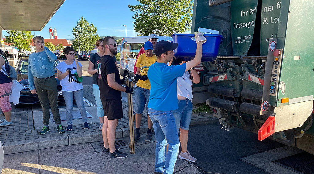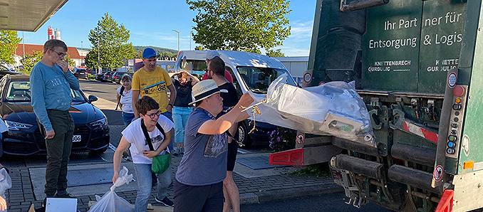 Zusätzlich stellen sie eine besondere Gefahr für die Gewässer dar, weil sie mit ihrem Mix aus Toxinen zwischen 40 und 60 Liter sauberes Grundwasser verunreinigen und auch das Pflanzenwachstum negativ beeinflussen. Nachdem die ehrenamtlichen Müllsammler am Rhönhof mit tütenweisem Müll angekommen sind, wurden sie von einem Müllfahrzeug des Eichenzeller Entsorgungsunternehmen Knettenbrech & Gurdulic empfangen, die extra für die vorbildliche Müllsammelaktion ein Fahrzeug nach Feierabend bereitgestellt haben. Mit Begeisterung durften die Herrenhausbewohner ihre Fundstücke selbst bei in das Müllfahrzeug einwerfen.