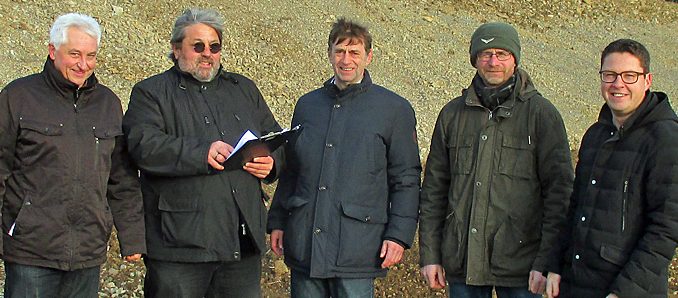 An der Übergabe der Multifunktionsfläche nahmen Erster Beigeordneter Hubert Schmelz, Erwin Kranz vom Amt für Bodenmanagement, Eiterfelds Bürgermeister Hermann-Josef Scheich, der Vorsitzende der Flurbereinigung, Thomas Sondergeld, und Joachim Lohfink von der gleichnamigen Baugesellschaft teil (v.l.n.r.).